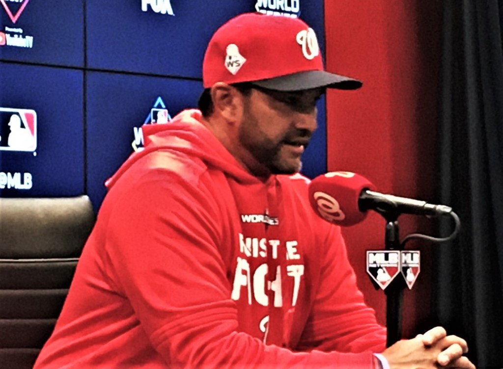 You win the World Series, the next time you lose a game you get asked, is everything okay? And the more experience you get with that the more you feel comfortable in your own skin. I think our players believe in themselves. I think they believe in the teammate next to them. We have a good process in place to game plan against the Nats. Now we have two games to learn from where they’ve played pretty well. And our guys believe we’re going to win the World Series.
