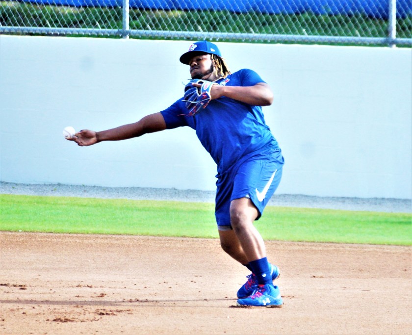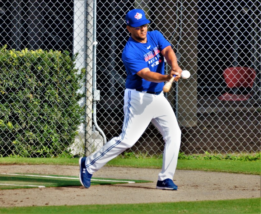 Third base coach Luis Rivera hits grounders to first baseman Rowdy Tellez and third baseman Vladimir Guerrero Jr. Tuesday in Dunedin.
