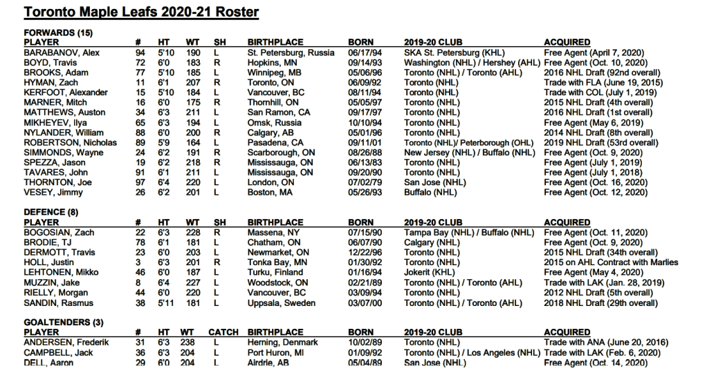 The Toronto Maple Leafs announced Monday that the team has trimmed their training camp roster to 26 players. The Leafs’ current roster includes a total of 15 forwards, eight defencemen and three goaltenders. An updated training camp roster can be found below.