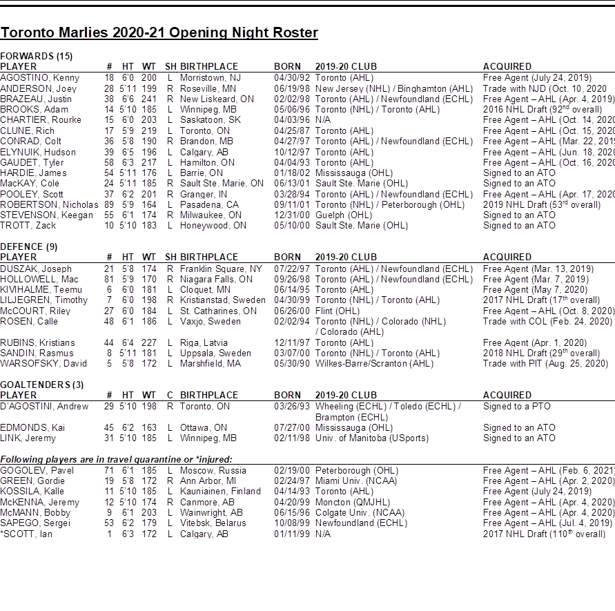 TORONTO MARLIES ANNOUNCE 2020-21 OPENING NIGHT ROSTER