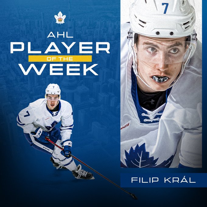 The American Hockey League announced today that Toronto Marlies defenceman Filip Král has been selected as the AHL Player of the Week for the period ending January 16.