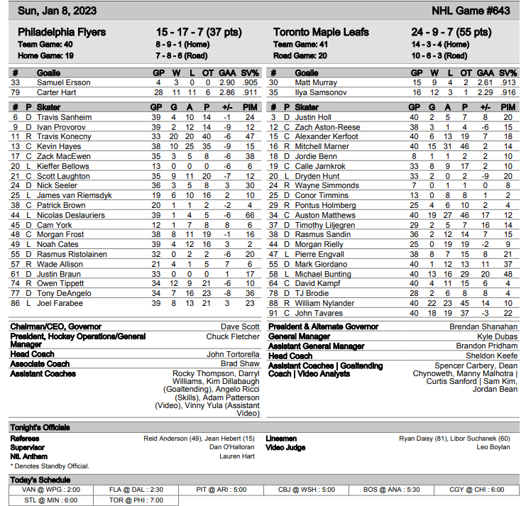 Penalty Minutes Mark Giordano (26), John Tavares (22), William Nylander (12), Jake Muzzin (12) - NEXT GAME