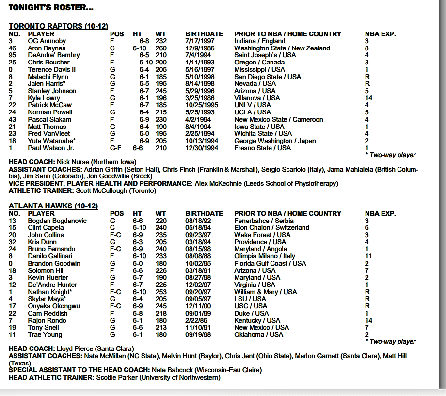 TOR@ATL Atlanta Hawks Bogdanovic, Bogdan Out Injury/Illness – Right Knee; Avulsion Fracture Dunn, Kris Out Injury/Illness – Right Ankle; Surgery Huerter, Kevin Probable Injury/Illness – Left Ankle; Soreness Hunter, De’Andre Out Injury/Illness – Right Knee; Discomfort Okongwu, Onyeka Questionable Injury/Illness – Left Achilles; Soreness Young, Trae Questionable Injury/Illness – Right Calf; Contusion Toronto Raptors Anunoby, OG Out Injury/Illness – Left Calf; Strain Flynn, Malachi Out G League – On Assignment Harris, Jalen Out G League – Two-Way McCaw, Patrick Out Injury/Illness – Left Knee; Surgery – rehabilitation