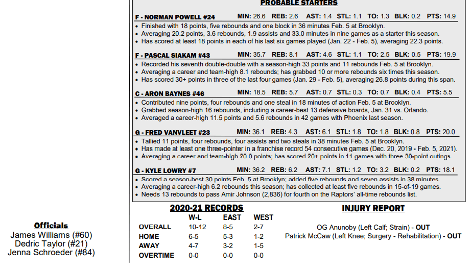 INJURY REPORT OG Anunoby (Health and Safety Protocols) – Out Terence Davis ll (Left Ankle; Sprain) – Questionable Malachi Flynn (Health and Safety Protocols) – Out Patrick McCaw (Health and Safety Protocols) – Out Pascal Siakam (Health and Safety Protocols) – Out Fred VanVleet (Health and Safety Protocols) – Out